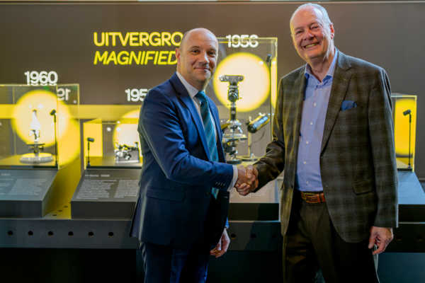 Uli Koch (on right) and Daniel Ciepielewski, Senior General Manager European Strategy, Product & Marketing & Deputy Vice President - Nikon Europe Healthcare (on left) in front of a display of Uli’s Nikon microscope collection at ARTIS-Micropia, Amsterdam