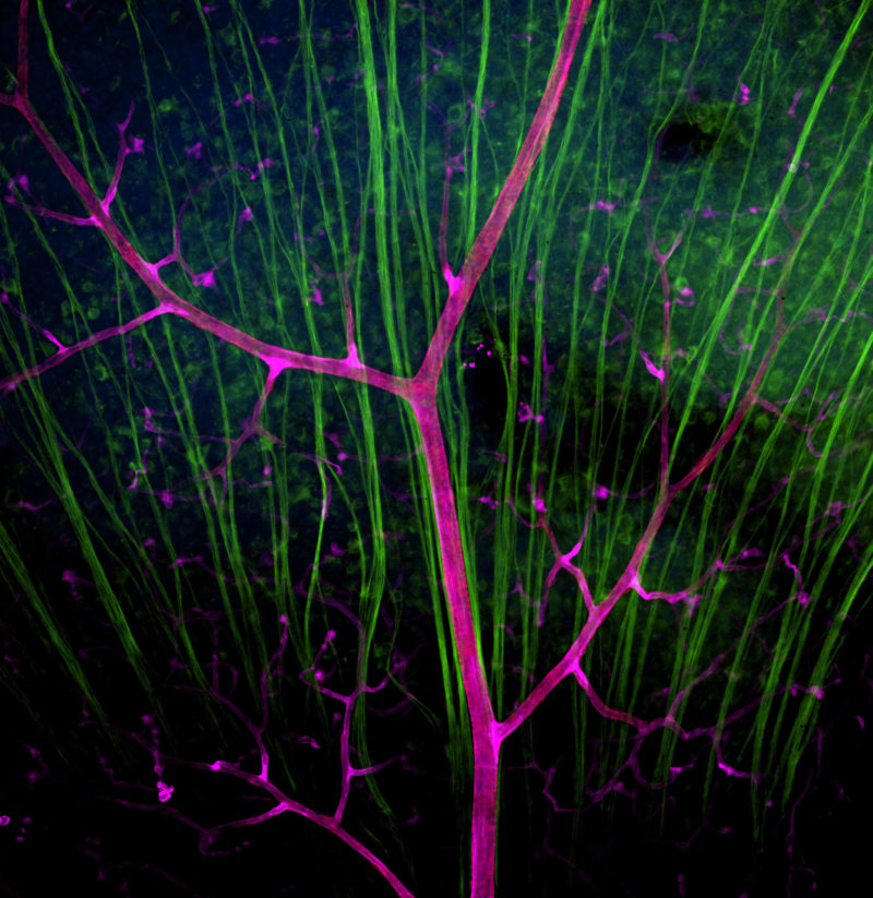 Mouse retina showing vasculature (red), nerve bundles (green) and macrophages (magenta)